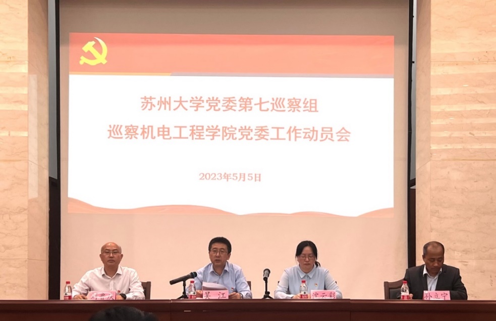 根据学校党委统一部署,校党委第一轮巡察第七巡察组于2023年5月5日至5月18日,对机电工程学院党委工作开展巡察。2023年5月5日下午,苏州大学党委第七巡察组巡察机电工程学院党委工作动员会在阳澄湖校区图书馆大报告厅召开。第七巡察组全体成员、机电工程学院党政班子成员和全院教职工参加了本次会议。动员会由机电工程学院党委书记刘鲁庆主持。