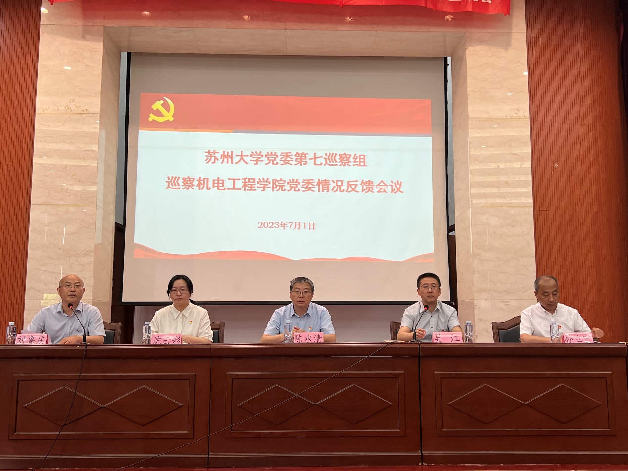 根据校党委第一轮巡察工作部署,2023年7月1日下午,苏州大学党委第一轮巡察第七巡察组巡察机电工程学院党委情况反馈会议在阳澄湖校区图书馆大报告厅召开。校党委巡察工作领导小组成员陈永清,第七巡察组组长吴江,副组长沈云彩以及第七巡察组全体成员,机电工程学院全体教职工参加了会议。会议由机电学院党委书记刘鲁庆主持。