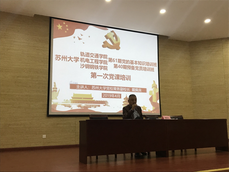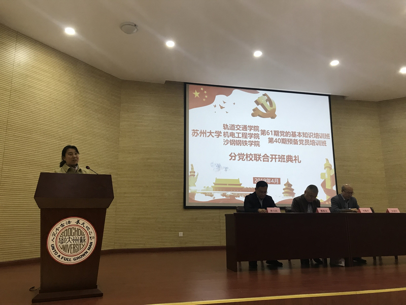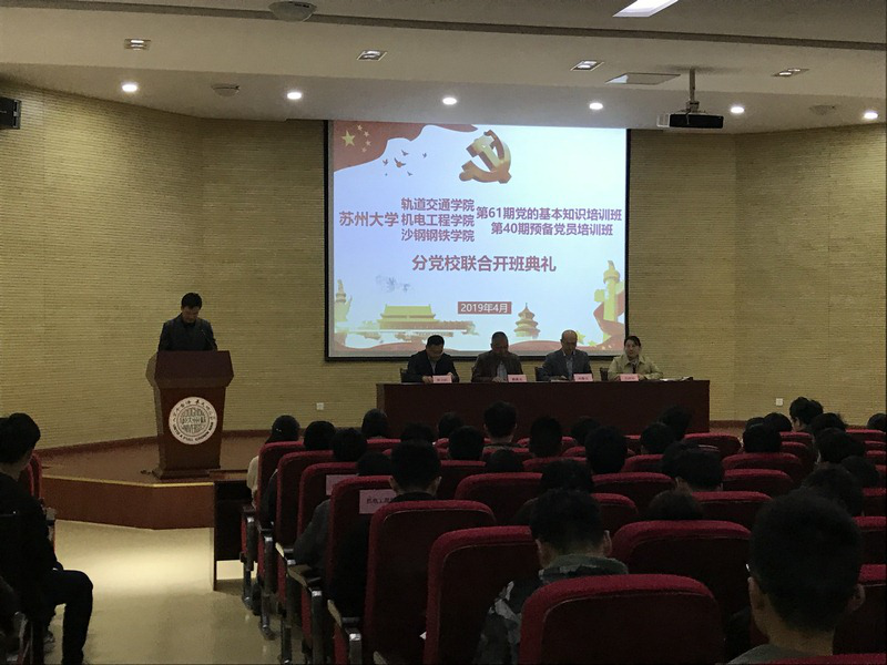 4月10日下午,轨道交通学院、机电工程学院、沙钢钢铁学院“第61期党的基本知识培训班暨第40期预备党员培训班分党校联合开班典礼”在阳澄湖校区交通大楼二楼学术报告厅举办。苏州大学党校常务副校长戴佩良,沙钢钢铁学院党委书记宋清华,机电工程学院党委书记刘鲁庆,轨道交通学院党委书记唐文跃,轨道交通学院党委副书记、副院长黄晓辉,以及三院分党校的工作人员,本期培训班的入党积极分子和预备党员共同出席了本次开班典礼及培训。开班典礼由黄晓辉老师主持。