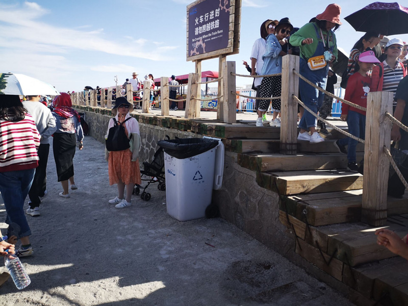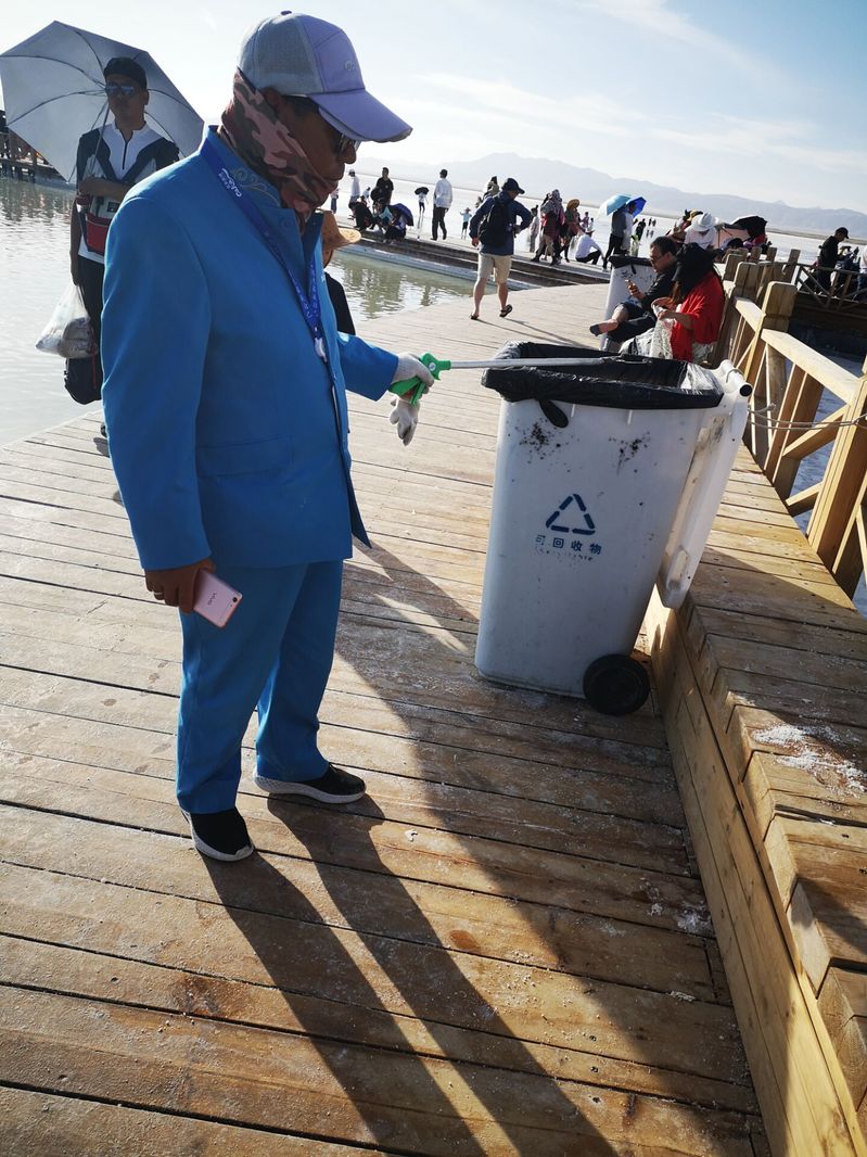 在实践开始落实前,实践团成员就已经对17、18年的茶卡盐湖旅游状况进行了解,这让实践团的考察工作有了更深入的进展。实践团经询问得知,现茶卡盐湖共有保洁类工作人员120余名,在旺季时还会聘用近一倍临时工。较往年变化最大的是今年茶卡盐湖开始将出售一次性鞋套变为租赁,一次支付5元,有100元押金,有效解决之前垃圾堆积如山的现象。同时约每五米处放置一个垃圾桶,保证景区卫生和环境生态。