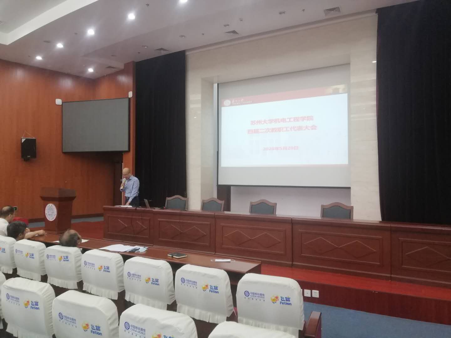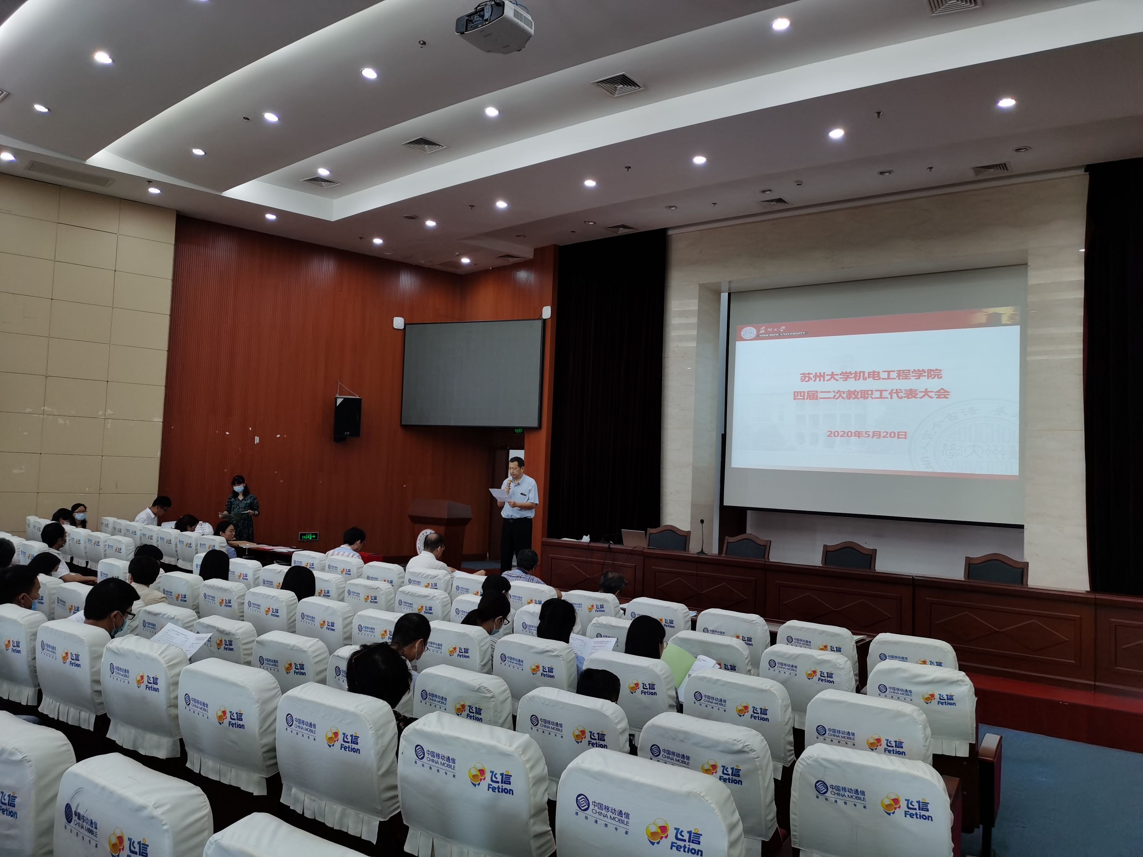 2020年5月20日下午,机电工程学院四届二次教职工代表大会在阳澄湖校区图书馆大报告厅举行。53位学院第四届教代会代表参加会议。