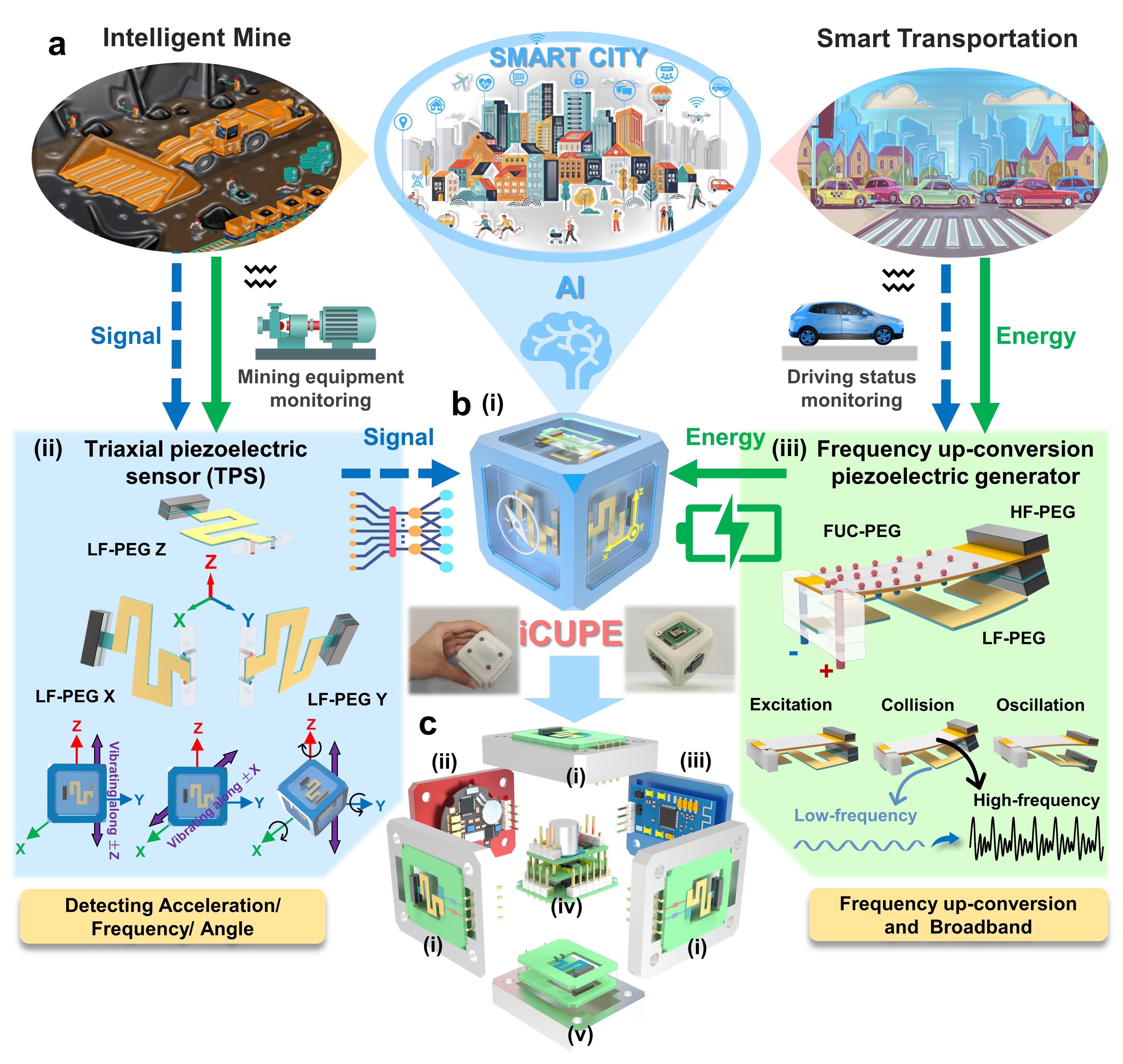该成果提出了一种基于压电材料的无线无源智能传感节点iCUPE,在收集环境振动能发电的同时采集和分析振动信号,与人工智能物联网、机器学习和数字孪生等前沿技术融合深化,能够以低成本构建完全自供电的智慧物联网系统。研究者们希望该工作能够打造出连接万物的“智能魔方”,为开发新型AIoT节点和推动智慧城市、工业制造、自动驾驶等领域的数字化转型发展提供启示。