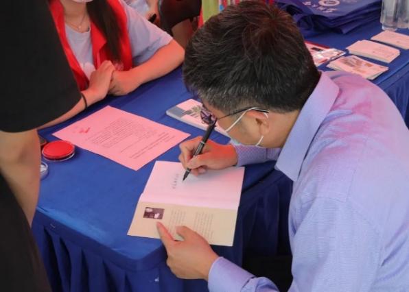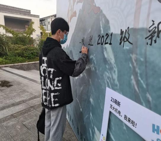 在荷花池边,学院为同学们准备了“征途漫漫,惟有奋斗”签名板,既是对新同学们的热切欢迎,也是在建党百周之际对青年学子提出的殷切希望。新生们怀揣着激动与兴奋,郑重书写下姓名。