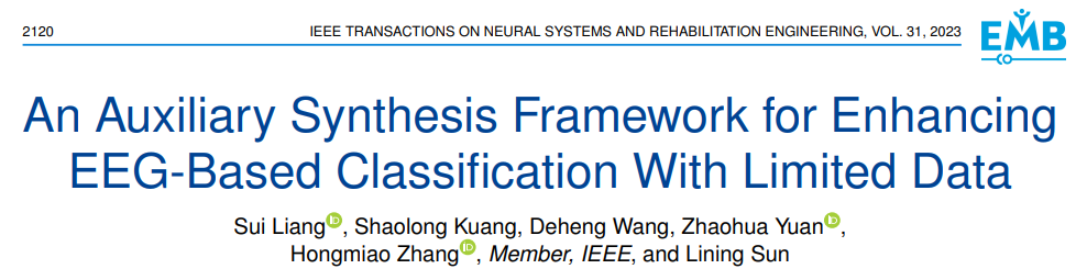 近日,我院孙立宁教授团队张虹淼课题组提出一种高质量脑电信号合成方法以促进脑机接口性能,研究成果《An Auxiliary Synthesis Framework for Enhancing EEG-Based Classification with Limited Data》在脑机接口领域权威期刊《IEEE Transactions on Neural Systems and Rehabilitation Engineering》(TNSRE)(IF 4.5 JCR Q1,年发文量200篇左右)发表。2021级硕士研究生梁随为第一作者,张虹淼副教授为通讯作者,苏州大学机电工程学院为第一作者单位。深圳技术大学健康与环境工程学院匡绍龙教授、上海中医药大学基础医学院王德恒教授、苏州大学硕士生袁兆华参与研究,孙立宁教授指导。该工作得到国家自然科学基金重大仪器研制项目的支持。(doi: 10.1109/TNSRE.2023.3268979)