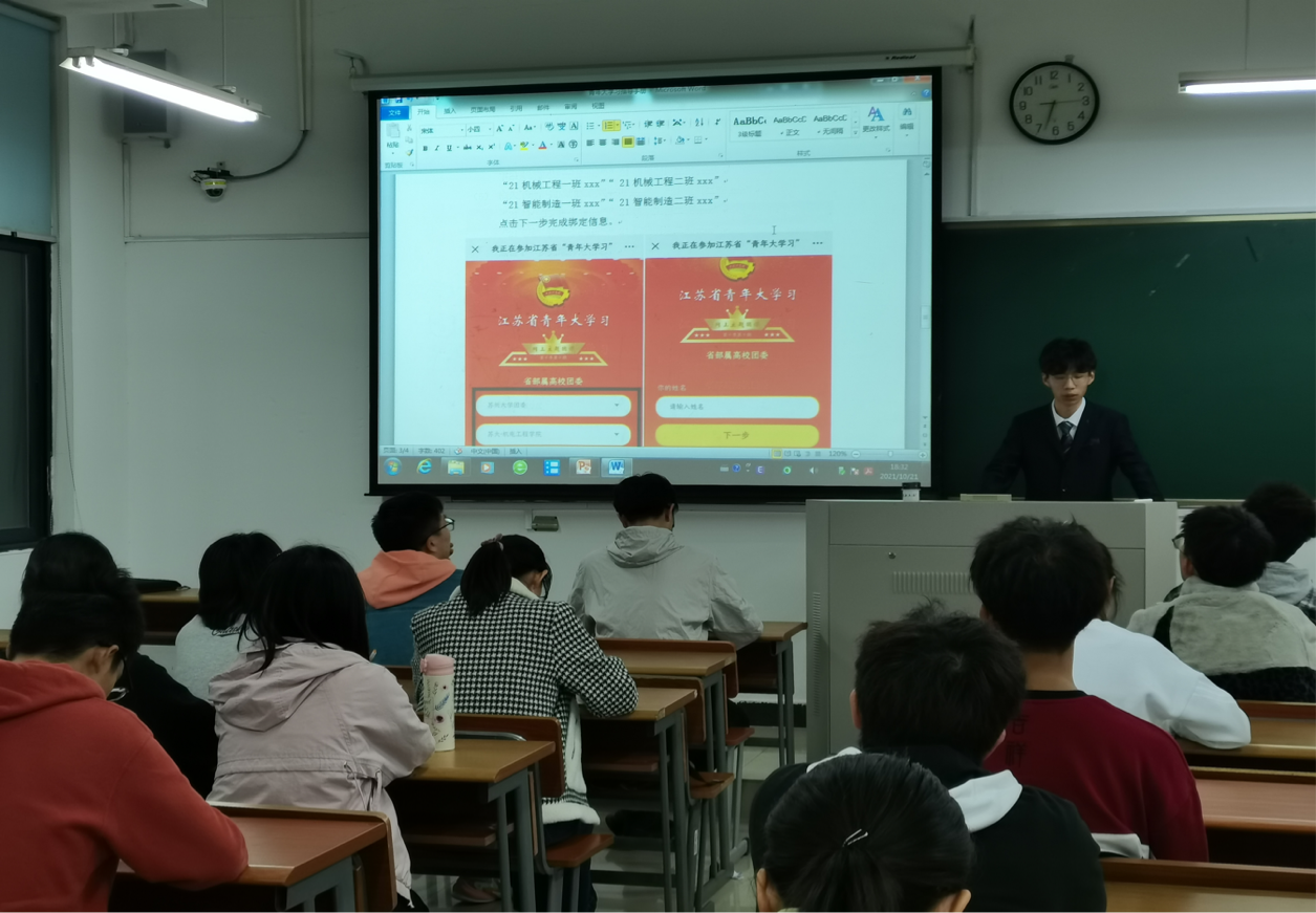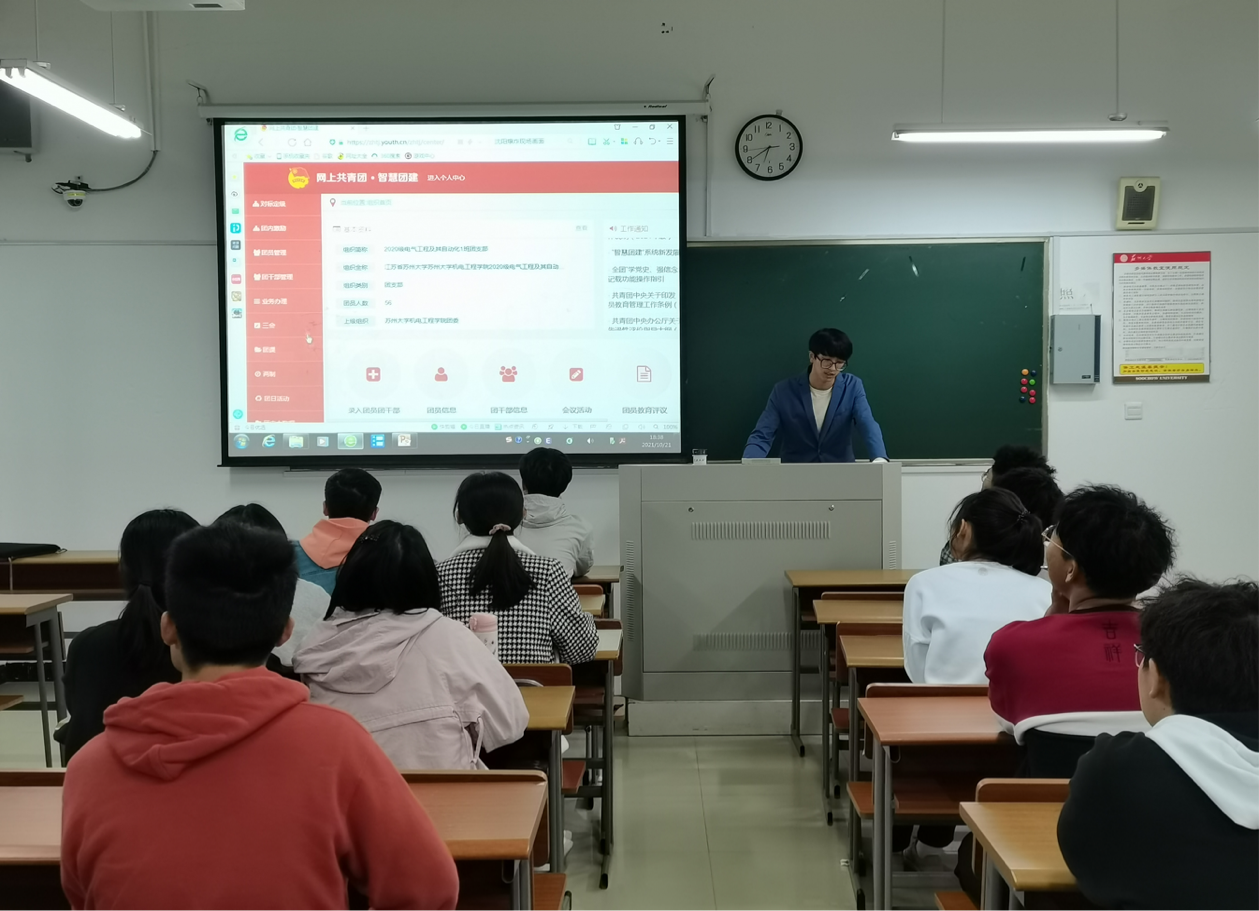 2021年10月21日星期四晚18:30,苏州大学机电工程学院“请党放心,强国有我”青马工程培训课暨2021年新上岗团支书培训会于苏州大学阳澄湖校区1A202举行。会议由我院团委办公室各部门部长主持,全体2021级本科生及研究生新上岗团支书参加。