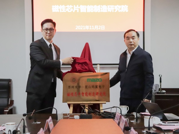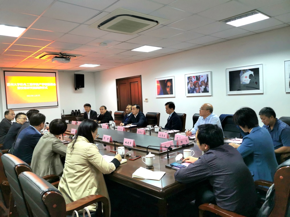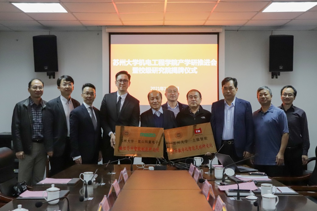 2021年11月2日下午,苏州大学机电工程学院在天赐庄校区绿波楼102室举行产学研推进会暨校级研究院揭牌仪式。苏州大学党委常委、副校长张晓宏,科技部部长郁秋亚,“2011计划”办公室主任仇国阳,江苏苏大投资有限公司董事长蒋敬东,机电工程学院院长孙立宁及学院领导班子成员,土猫(苏州)智能科技有限公司总经理周立群,昆山玛冀电子有限公司副董事长程彧倞等企业代表出席活动。学院副院长陈涛主持活动。
