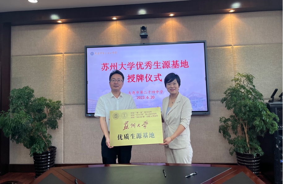 双方共同签署了优质生源基地建设协议书,解笑副书记为大连市第二十四中学授予“苏州大学优质生源基地”铜牌。