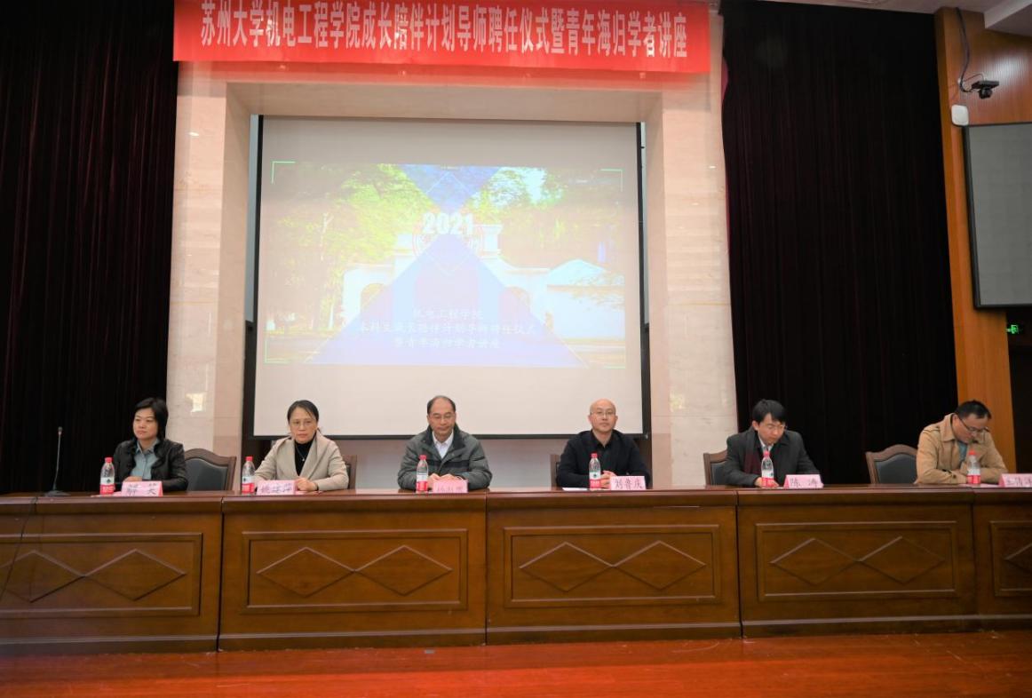 为深入贯彻习近平总书记关于教育的重要论述,全面落实立德树人根本任务,深化“三全育人”综合改革,进一步提升我院人才培养质量,11月10日下午,机电工程学院成长陪伴计划导师聘任仪式暨青年海归学者讲座于阳澄湖图书馆大报告厅顺利举办。学院党委书记刘鲁庆,院党委副书记、副院长解笑,院副院长陈涛、王传洋,学院纪检专员姚建萍出席活动。学院德政导师、学业导师、朋辈导生代表与2021级新生参加,仪式由2021级新生辅导员刘婷玉主持。