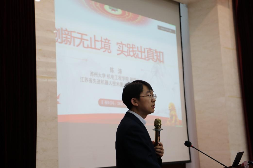 聘任仪式结束后,学院副院长,江苏省先进机器人技术重点实验室副主任陈涛老师为同学们带来《创新无止境 实践出真知》讲座。陈老师指出,科研的过程是自信心培养的过程,有了信心,就能够挑战更难的项目。他鼓励同学们带着目的学习,提高效率,方能达到事半功倍的效果,同时要保持学习热情,不畏困难、坚持奋斗。在讲到“挑战杯”大赛时,陈老师结合自身科研经历,表明挑战杯的创意应结合国家重大需求,也应该充分发挥自身的奇思妙想和创造力。在比赛中充分锻炼自己,发掘内心真正所想,并为之不懈努力。