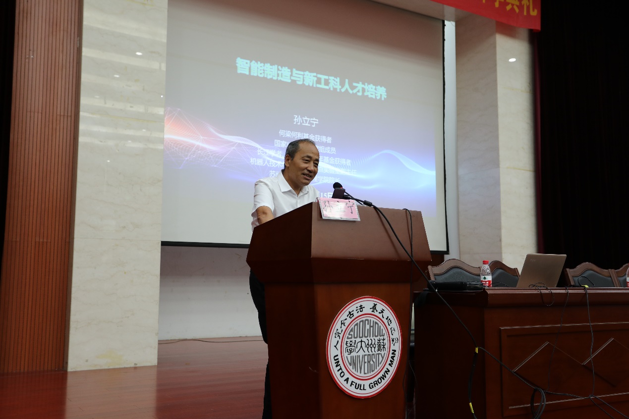 院长孙立宁致欢迎辞。孙院长首先代表学院对2020级新生的到来表示热烈的欢迎和祝贺,并为同学们简要介绍了学院基本情况、学科专业的研究方向、发展前景、科研教育平台、特色实验室等内容。知识在于运用,孙院长还分享了疫情期间我院自主研发的消毒机器人为抗疫事业做出的贡献,鼓励同学们勇于创新,敢于钻研,为社会主义事业奉献自己的力量!他对大家寄予厚望,希望同学们要有家国情怀,勇担使命,具备全球视野,脚踏实地,实现中国梦。