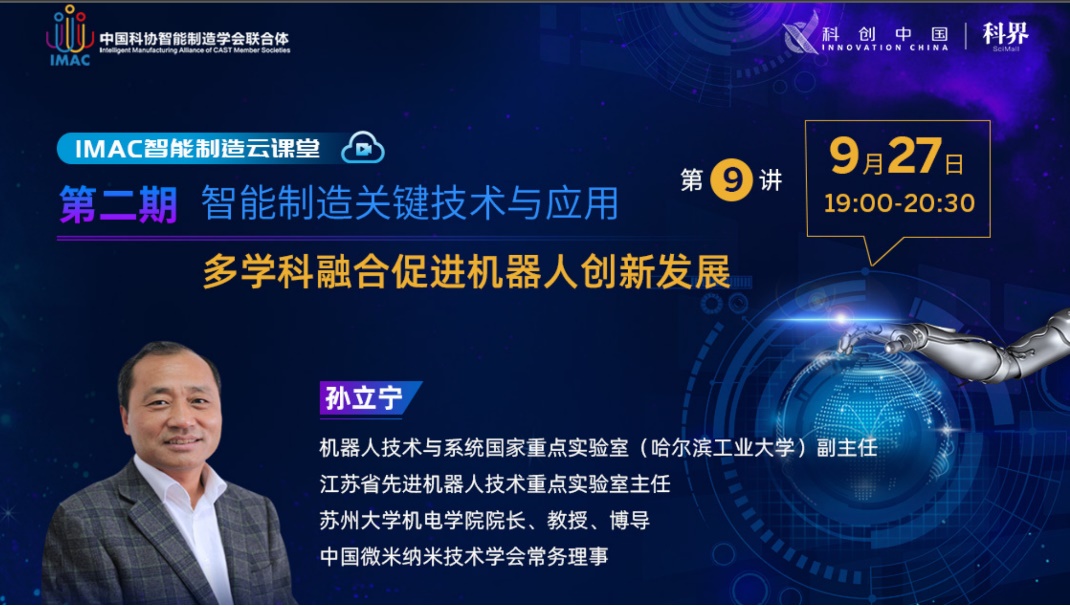 受中国科协智能制造学会联合体(IMAC)邀请,2020年9月27日,我校机电工程学院院长孙立宁教授主讲了“IMAC智能制造云课堂”第二期第9讲的内容,以线上交流的方式与观众互动。