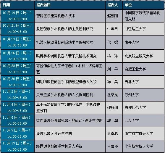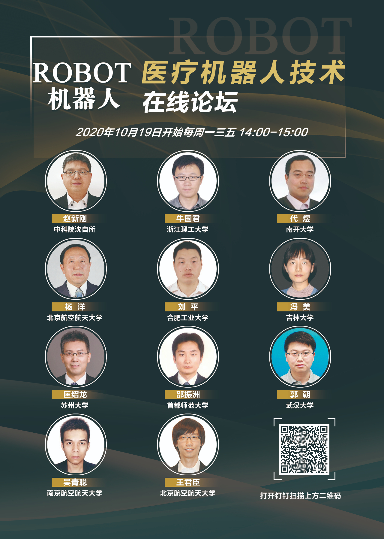医疗机器人技术在线论坛邀请了医疗机器人技术领域的11位《机器人》通讯作者做在线报告,介绍这些优秀科研团队的最新学术进展!10月19日开始每周一三五下午14:00-15:00准时开始,日程请先收好,记得准点来围观哦!使用钉钉app扫描下方海报中的二维码入群,还有机会与报告人在线交流!
