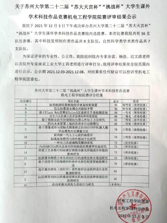 12月3日下午,第二十二届“苏大天宫杯”“挑战杯”大学生课外学术科技作品竞赛院内选拔赛在行政楼210成功举办。选拔赛特邀院内专家余雷、杨浩、迟文政老师以及院外专家南京工业大学王莉老师进行评审打分。本次比赛,我院共有16支队伍进入答辩环节,其中9个科技发明制作类作品,7个自然科学学术类作品。