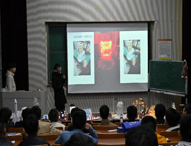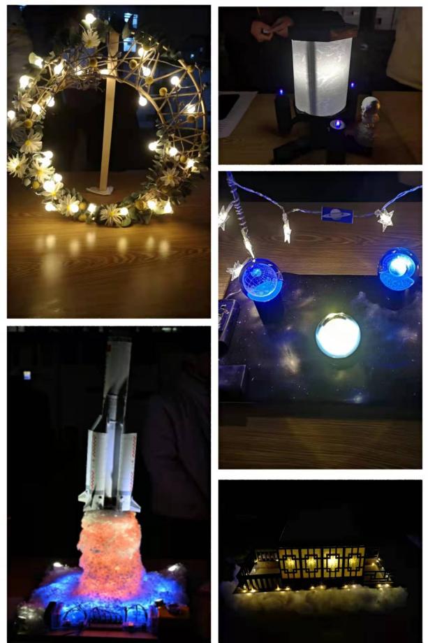 随后,各参赛队伍通过PPT展示并讲解参赛作品,阐明了作品寓意、作品材料环保性等要点,重点突出了作品的制作过程与技术原理。“追梦·航天”灯光作品恢宏大气,弘扬航天精神,表明建设航天强国的决心。