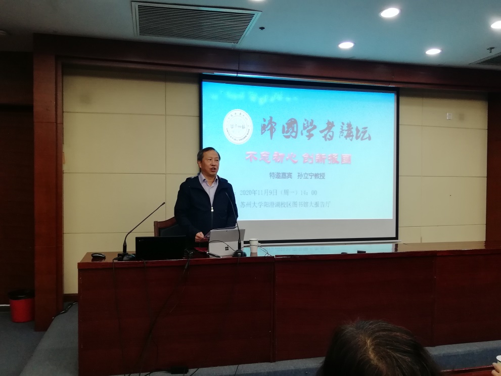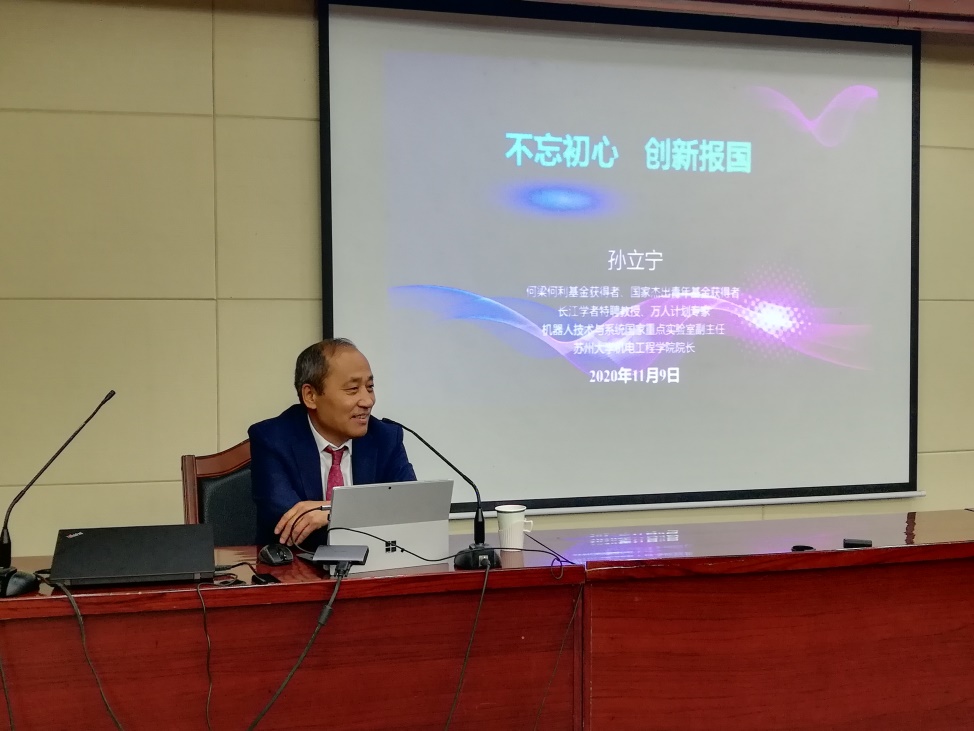 2020年11月9日,受校党委统战部和学生工作部(处)主办的归国学者论坛的邀请,孙立宁教授为阳澄湖校区的师生们带来了一场精彩的励志讲座。本次活动由党委常委、党办主任、统战部部长薛辉主持。学生工作部副部长潘爱华,统战部统战员刘海平,欧美同学会秘书长秦炜炜,机电工程学院党委书记刘鲁庆、党委副书记副院长袁红出席讲座。