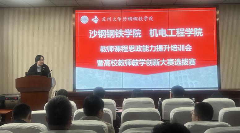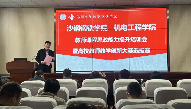 为深入学习贯彻习近平新时代中国特色社会主义思想和党的二十大精神,落实全国教育大会精神和中共中央、国务院《关于全面深化新时代教师队伍建设改革的意见》要求,进一步加强高校教师队伍建设,大力弘扬教育家精神,助力高等教育高质量发展,沙钢钢铁学院和机电工程学院于12月12日联合举办了教师课程思政能力提升培训会暨高校教师教学创新大赛选拔赛。