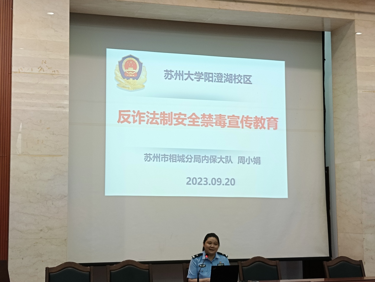 苏州市相城分局内保大队周小娟同志给同学们做反诈法制安全禁毒宣传教育。周警官结合真实案例讲解电信网络诈骗的惯用套路,并重点介绍了针对大学生群体实施的刷单返利、网络交友、游戏充值、冒充客服等电诈类型。用通俗易懂的语言和贴合实际的案例,让同学们从根本上了解如何预防电信诈骗、发生电信诈骗案件后应该采取的有效措施。希望同学们在提高自身识骗防骗意识的同时,当好身边人员的反诈宣传员,助力防范电信网络诈骗。接着周警官向同学们讲解了基础的法制知识,也对同学们进行了禁毒宣传教育。