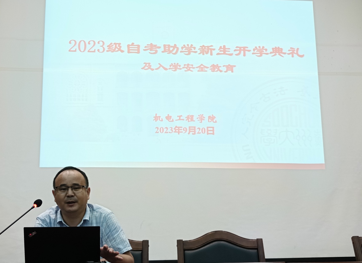 2023年9月20日下午,我院2023级自考助学新生开学典礼在苏州大学阳澄湖校区图书馆大报告厅顺利举行,副院长孙海鹰、自学考试办公室王平老师、各班班主任王建胜、华梁、吴晨倩、徐易芸老师,170名新生参加了开学典礼。本次典礼由王平老师主持。