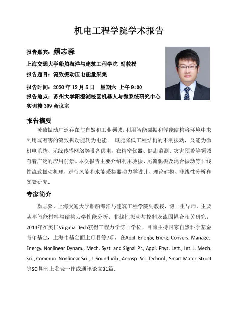 机电工程学院学术报告:流致振动压电能量采集