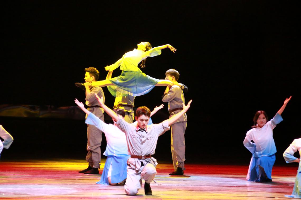由14名机电工程学院新生舞者带来的《我们的歌》惊艳四座。“一个个弧线在指尖划过,一条条柳枝和着阳澄湖的风摇曳岸边。蝴蝶之姿,曲伴舞生,唱着我们的歌。”大幕拉开,《长亭外》奏起,一股伤感的氛围迎面袭来。一位是征战在外的军人丈夫,一位是守候家中的贤惠妻子,原本和平安乐的幸福生活在家国之难面前不值一提。从初知消息的慌乱焦急,到决然分别的坚定不舍,两位主舞用夸张而又深情的动作细腻诠释:他们或是深拥,或是对望,或是将所有情绪汇于指尖,想要伸手却又收回。八名伴舞舞姿曼妙,婀娜不失清冷,皎洁而忧伤,让人身历其境,感受送别将士的悲伤。音乐声突转,在紧迫情况中,五名士兵毫无畏惧,英勇前进。他们是神圣的冲锋战士,冒着枪林弹雨,毅然向前。他们腾空跳跃,尽显敏捷;他们匍匐翻滚,毫无畏惧;他们像最尖锐的利刃,彰显出专属于中国军人的飒爽英姿。即使未能抵过烈火的冲击,他们的精神永驻人间!舞蹈接近尾声,《今天是你的生日,我的中国》的旋律缓缓响起,舞蹈演员们热泪盈眶,激昂挥舞,用最真诚的舞蹈致敬新中国成立70周年!