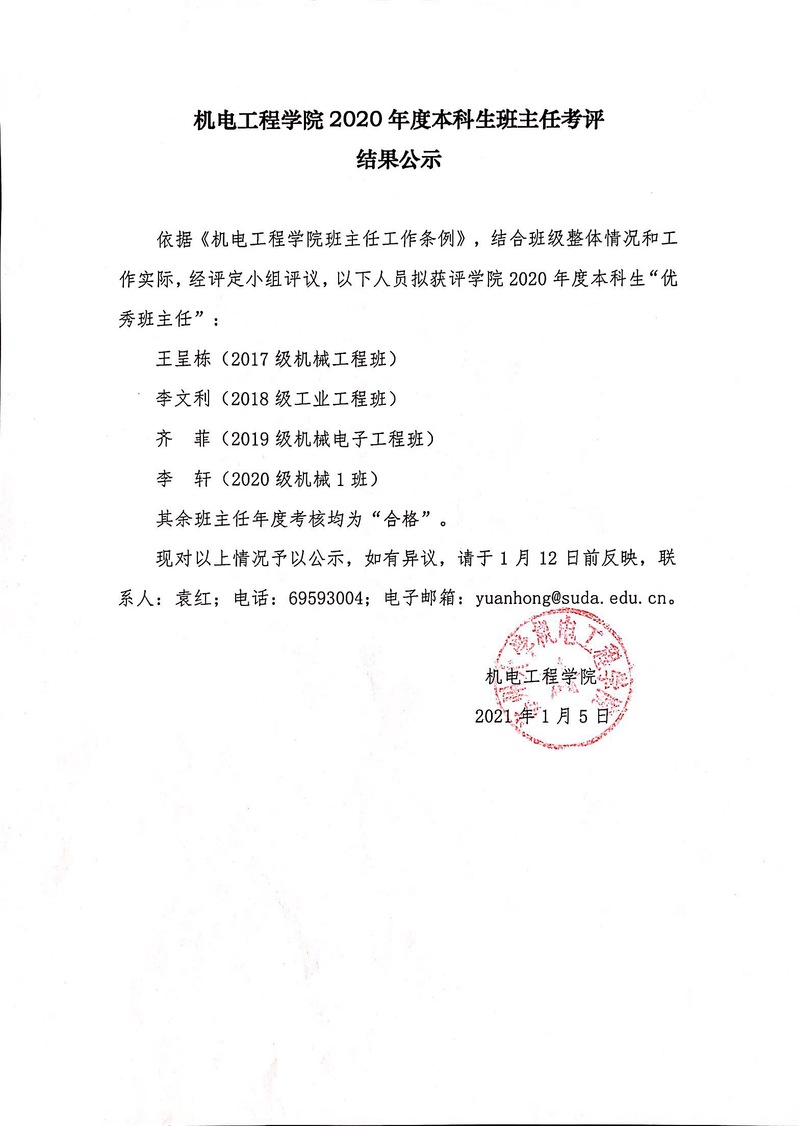 机电工程学院2020年度本科生班主任考评结果公示