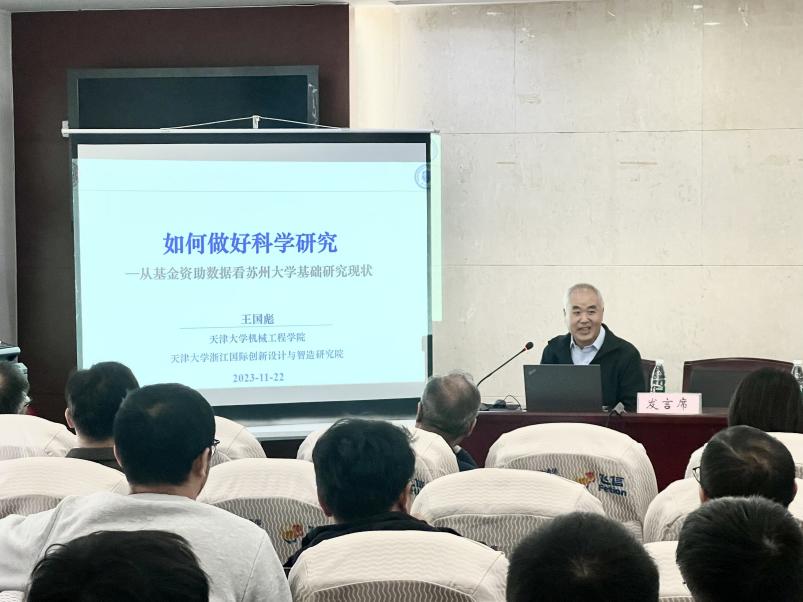 王国彪教授以“如何做好科研一从基金资助数据看苏州大学基础研究现状”为题作辅导报告,他通过回顾苏州大学历年来自然科学基金(特别是工程与材料领域)的资助数据,分析其基础研究的现状;在分析机械工程领域基础研究高层次人才(国家杰出青年科学基金和优秀青年基金)资助数据的基础上,探究杰出人才的成长路径,并就如何做好科学研究提出几点建议,鼓励广大科研工作者沿着选定的科研方向持续研究,坚持不懈地将科学技术问题做深、做透。