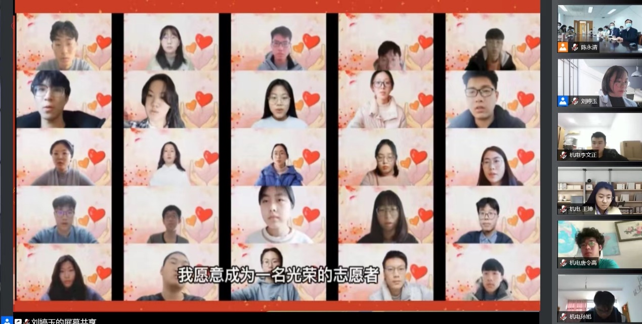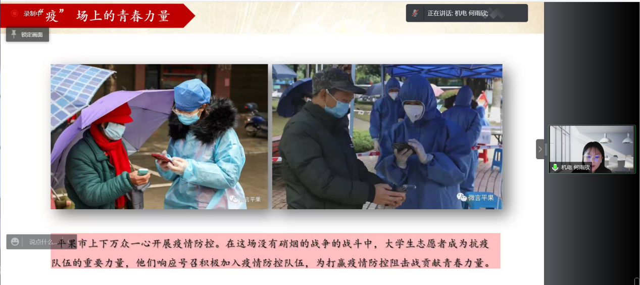 接着是“机”聚群力,“电”亮风采——机电青年战疫事迹分享环节。何雨欣同学分享了她的家乡广西百色市出现疫情后的故事。疫情出现后,当地报名的志愿者远远超于需求量,其中有非常多年轻的血液,百色人民同舟共济,共克时艰。杨旻鑫同学则讲述了他在苏州疫情期间成为志愿者的原因、具体的工作、遇到的困难和收获与感悟。赵安同学分享了他的志愿工作,录入疫苗注射信息时遇到的问题与解决方法,并号召同学们与时俱进跟党走,青年志愿我先行。