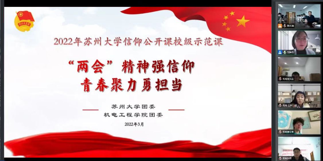 2022年3月30日下午13:30,苏州大学“两会精神强信仰,青春聚力勇担当”信仰公开课校级示范课于腾讯会议平台顺利举行。本次会议由苏州大学团委主办,机电工程学院团委承办。苏州大学青马工程领军计划全体学员、苏州大学机电工程学院青马工程精英计划全体学员和机电学院学生骨干共计200余人参与本次活动。