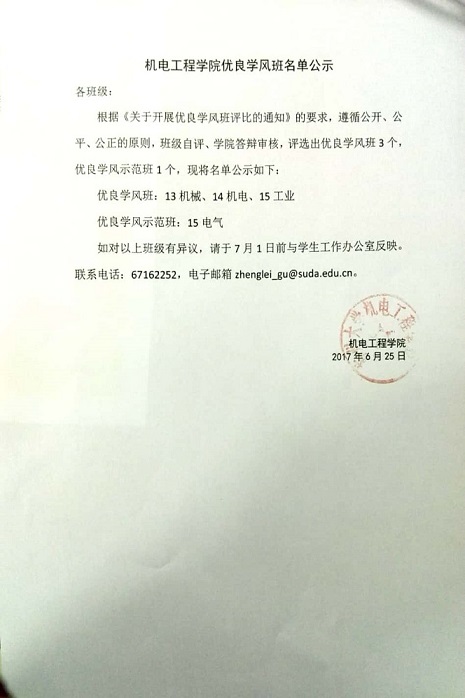 2017年机电工程学院优良学风班名单公示