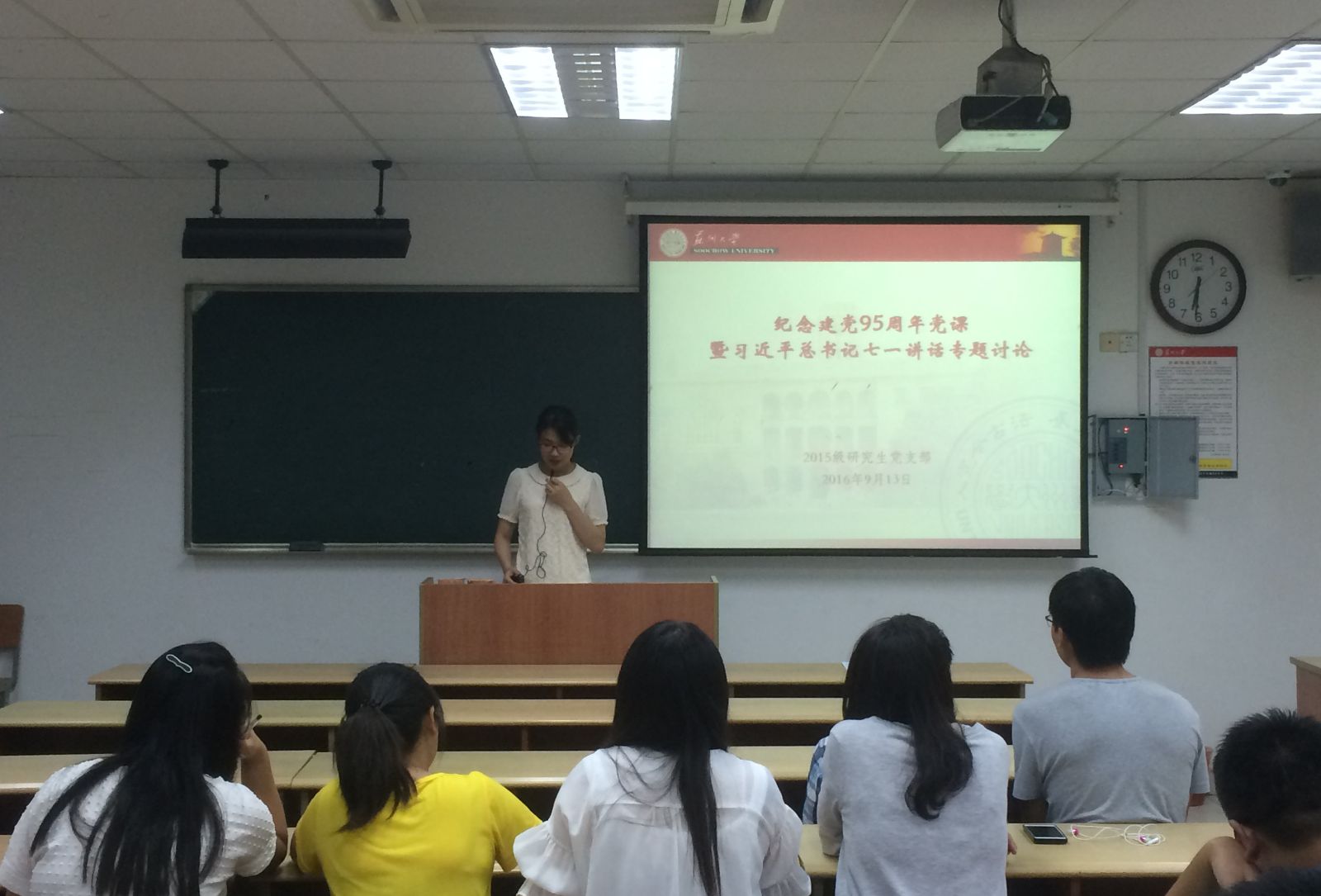 恰逢中国共产党成立95周年,为深入开展“两学一做”学习教育, 9月13日晚,2015级研究生党支部在工科楼205室开展了庆祝建党95周年党课暨习近平总书记“七一”重要讲话专题讨论活动。党支部书记姜曼老师主持讨论并主讲,支部23名党员到场聆听并参与专题讨论。