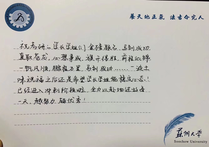 下午5点,学院领导老师们来到考研教室,亲手将奶茶和明信片送给正在紧张复习的考研学子们,并表达了衷心祝愿。刘鲁庆书记亲切慰问同学们,肯定大家一直以来求学奋进的努力,希望在最后冲刺阶段稳定心态,保持考研必胜的自信,不骄不躁。袁红副书记关切询问同学们的复习进度,鼓舞大家要减少干扰因素,充分利用最后考前时间,祝愿同学们取得满意成绩。同学们满怀感动,纷纷表示感谢学院给他们的关心爱护,体会到了机电工程学院这一大家庭的温暖。