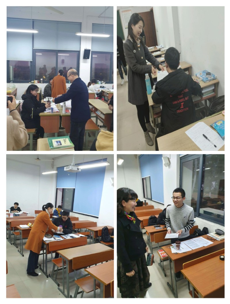 晚上7点,学生会和新媒体成员走进教学楼,将第二波温暖送至考研学子的手中。学弟学妹们献上真挚的祝愿,一杯杯奶茶、一张张明信片被送到每一位考研学子手中,驱散了冬日的严寒,传递了真诚的鼓励,让他们在这个复习考研的冬夜感受到温暖。