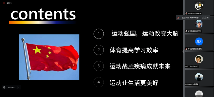 陶新华老师围绕“体育让学业更优、生活更美好”的主题,从运动强国、运动提高学习效率、运动战胜疾病成就未来、运动让生活更美好四个方面展开叙述。通过列举谷爱凌、钟南山等鲜活生动的实例,陶老师以风趣幽默的语言风格,结合积极心理学的专业知识,将深奥的道理以深入浅出的方式向同学们讲解体育运动对我们日常生活与学业的影响。