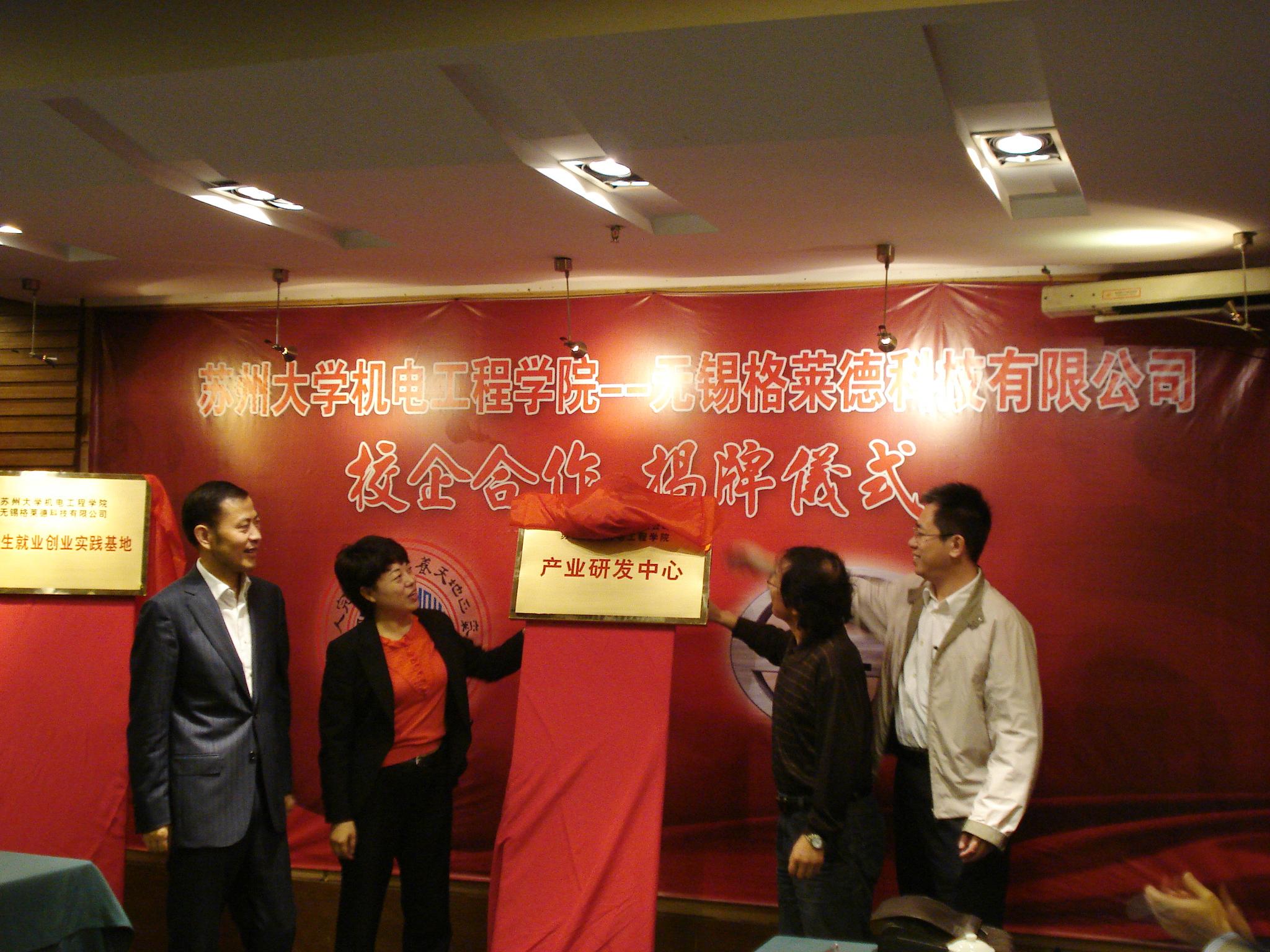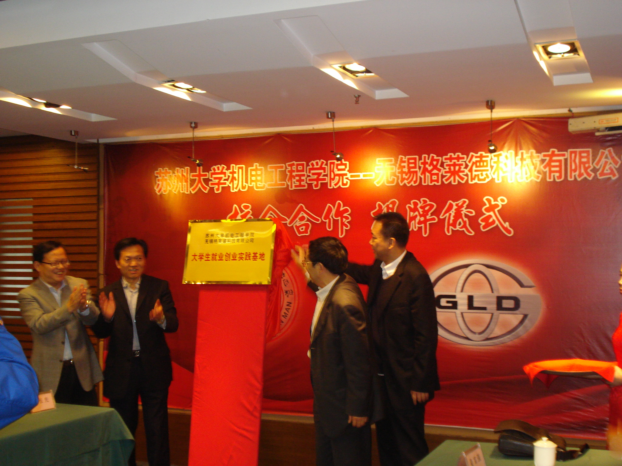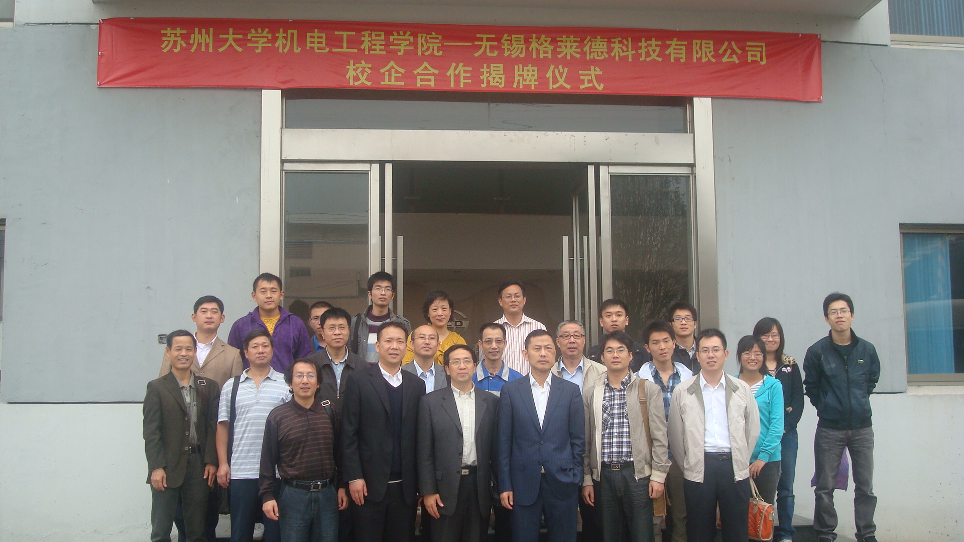 11月8日,机电工程学院与无锡格莱德科技有限公司在美丽的无锡市惠山区前洲街道举行校企合作揭牌仪式。机电工程学院与无锡格莱德科技有限公司在前期沟通商讨,达成共识的基础上,签署了校企合作培养人才、开展科技研发的合作协议,成立了苏州大学机电工程学院—无锡格莱德科技有限公司大学生就业创业实践基地、无锡格莱德科技有限公司—苏州大学机电工程学院产业研发中心。无锡市惠山区前洲街道党工委书记莫治中等无锡前洲街道党政领导,苏州大学机电学院党委书记王永山、苏州大学大学生职业生涯规划辅导中心副主任黄文军、机电学院副院长冯志华、钮秀山、副书记刘鲁庆以及各系主任、部分教师、学生代表,无锡格莱德科技有限公司董事长王兴瑶、董事过伟、张清江、刘长先等出席了揭牌仪式。