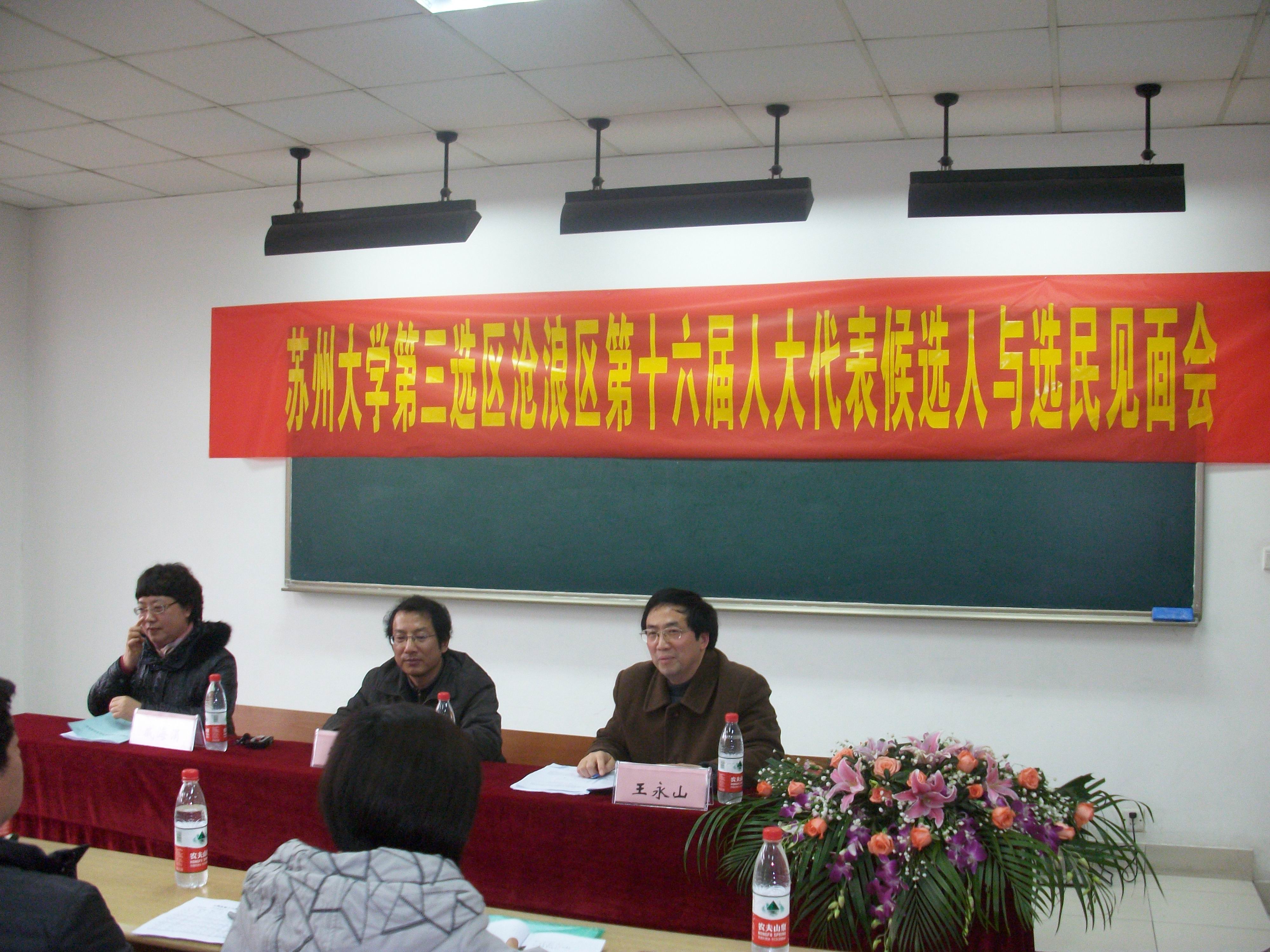 苏州市沧浪区人大常委会副主任王树民、区人大研究室主任林晓冬、区人大常委会办公室秘书朱守春和苏州大学党委副书记副校长江涌、校党委组织部副部长查佐明等领导出席此次见面会。两位代表候选人机电工程学院冯志华教授、教服集团戚海涓老师以及第三选区各选民小组推荐的的60名选民代表参加了见面会。 王永山简要介绍了第三选区的情况,宣读了全国人大选举法、江苏省人大选举实施细则以及沧浪区选举委员会关于召开代表候选人与选民见面会的有关法律规定,两位代表候选人分别作自我介绍以及当选代表后的打算的陈述发言。 在选民提问阶段,两位候选人分别回答了选民代表提出的若干问题,为苏州市沧浪区的发展出谋划策,深情祝福苏州的明天更加美好。两位候选人都表示如果当选,一定会积极承担起人民代表应该履行的职责,承诺一定做到“心为民所系、权为民所用、利为民所谋”,积极调研和反馈人民群众所关心、关注的问题,反映真实民众的迫切诉求,从而实现民主意愿的集中。 见面会上,选民代表们积极地提出问题,热情高涨地担任了“主考官”这一角色,两位候选人也分别给出了令人满意的答案,会议开得圆满成功! 撰稿人:高翔