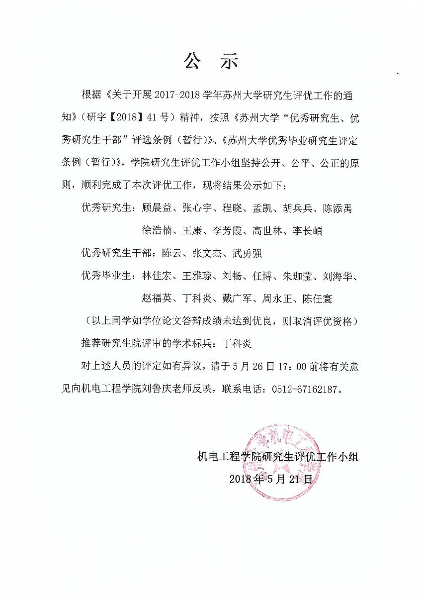 对上述人员的评定如有异议,请于5月26日17:00前将有关意见向机电工程学院刘鲁庆老师反映,联系电话:0512-67162187。