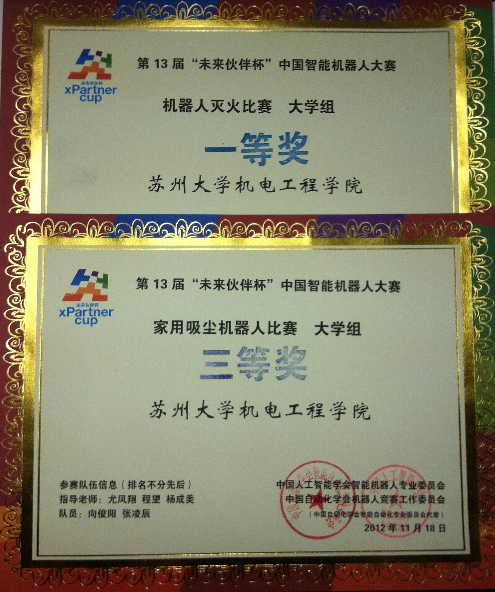 由机电工程学院副院长尤凤翔教授担任领队,林健荣、陈庆、黄克亚、程望、杨成美等五位指导老师及魏然、梅艳、张凌辰、向俊阳四名学生组成的机电工程学院代表队参加本届大赛并取得了“国际赛制机器人灭火”、“能力风暴家用除尘机器人”比赛一等奖、三等奖的好成绩。