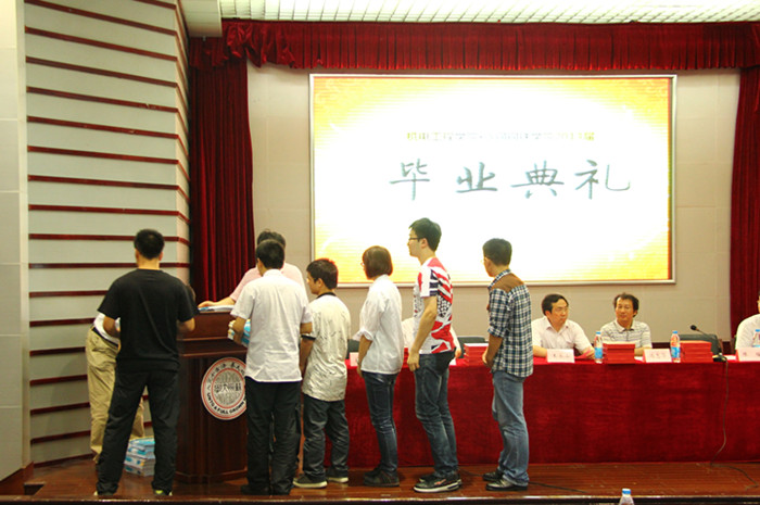 最后是毕业典礼最激动人心的时刻—-颁发毕业证书。这是对毕业生四年学习与工作的认可。伴随着喜庆的音乐,毕业生们上台从领导手中接过那一本本蓝色的毕业证,并与教导了自己几年的老师亲切握手、拥抱,每一张脸上都洋溢着幸福的微笑。离开母校以后的日子,会有更多的艰难险阻,但我们有理由相信,这四年积累的经验,收获的知识,老师的教诲,同窗的鼓励都会让毕业生不畏困难,锐意进取!
