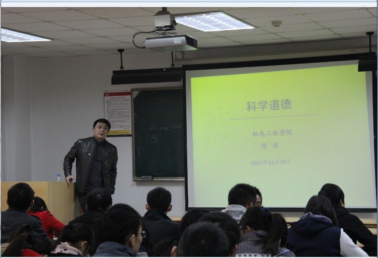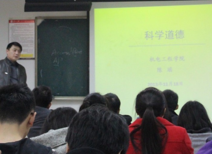 为进一步规范学院科学研究工作,大力弘扬科学道德、建立良好的学术风气,2013年11月20日我院副院长陈瑶教授在工科楼208为本院研究生进行一次了关于科学道德建设的讲座。
