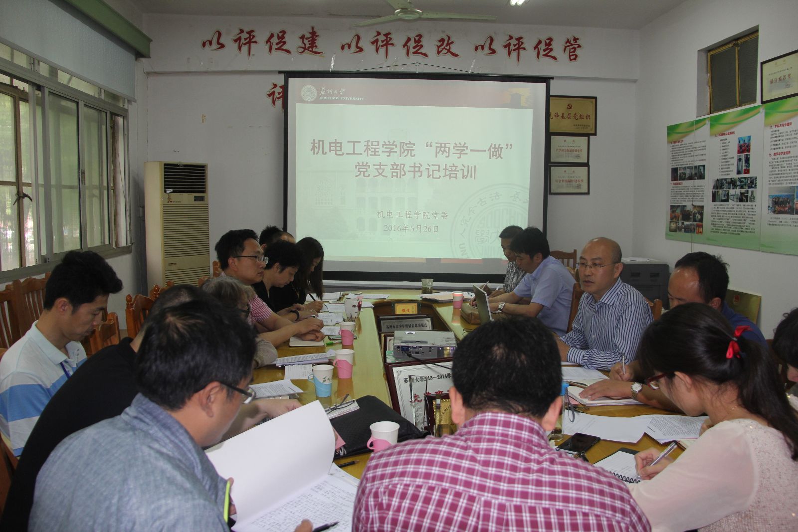 为切实推进“两学一做”学习教育的开展,5月26日下午,机电工程学院在丝韵楼208会议室召开学习教育推进会暨第二次党支部书记专题培训会。学院党委书记刘鲁庆主持会议,学院部分领导班子成员和全体党支部书记与会。