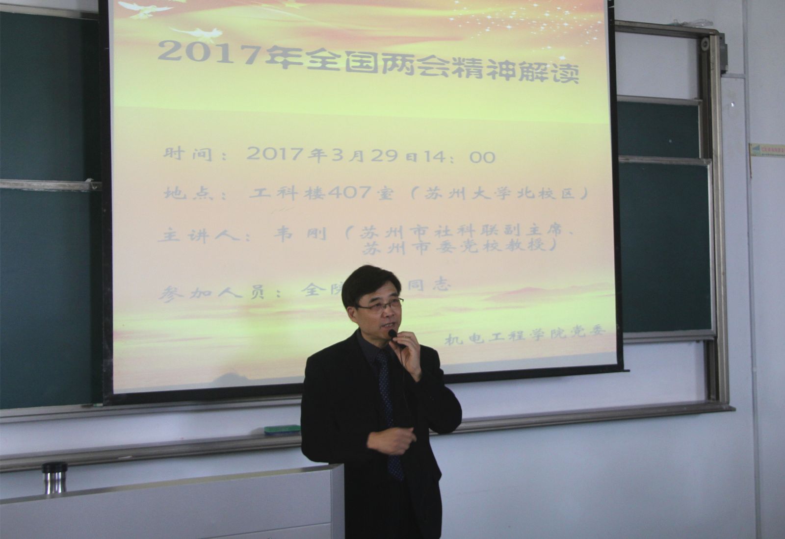 3月29日下午,机电工程学院党委在北校区工科楼407室组织开展党员集中培训教育。此次集中培训教育以“2017年全国两会精神解读”为主题,院党委邀请苏州市社科联副主席、苏州市委党校教授韦刚为全院师生党员做专题报告。报告会由学院党委书记刘鲁庆主持,全院200多名师生党员参加了报告会。
