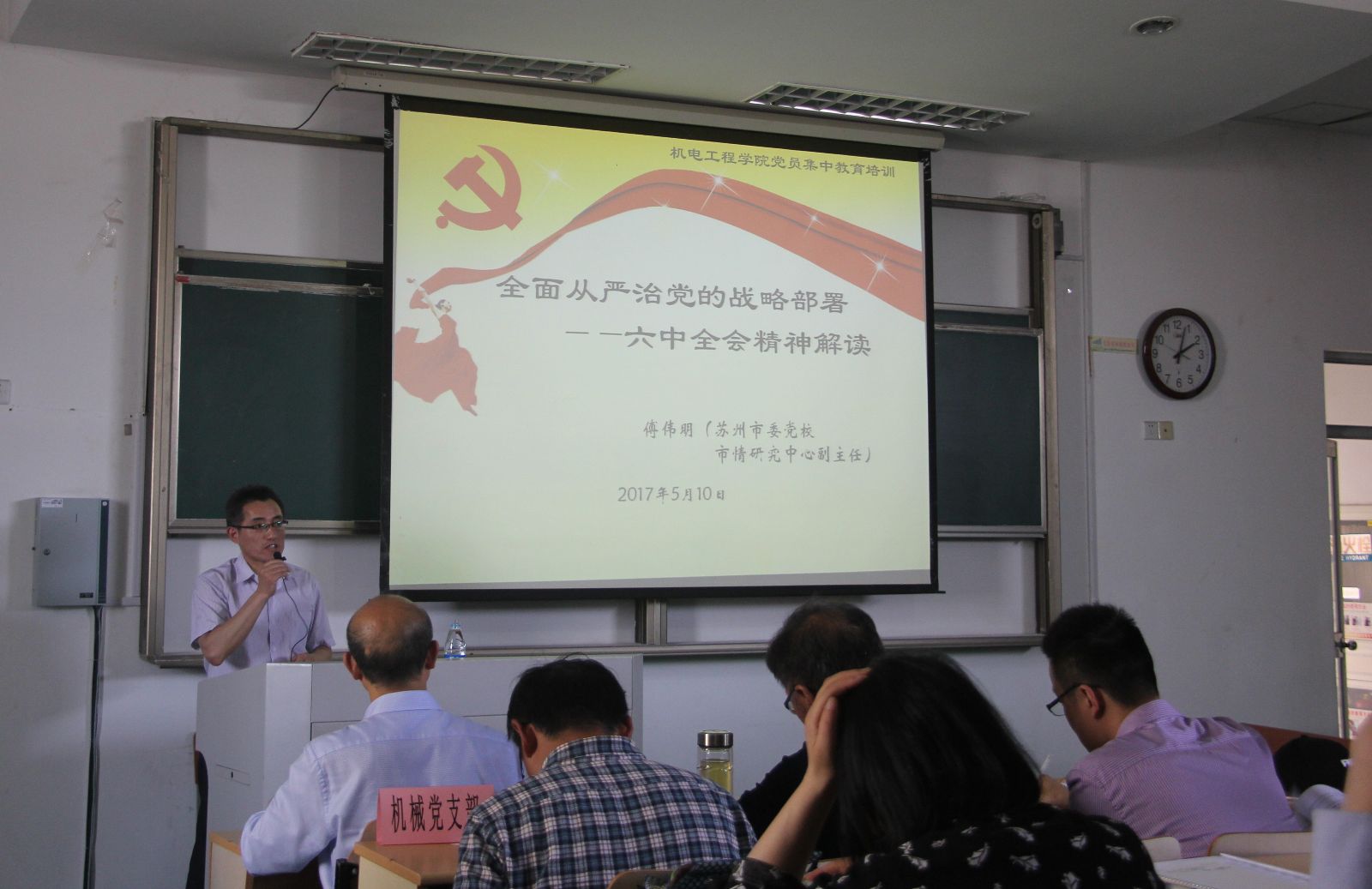 5月10日下午,机电工程学院党委在北校区工科楼407室组织开展党员集中培训教育。此次集中培训教育以“党的十八届六中全会精神”为主题,由苏州市委党校市情研究中心副主任傅伟明为全院师生党员作题为“全面从严治党的战略部署——六中全会精神解读”的专题报告。报告会由学院党委书记刘鲁庆主持,全院200多名师生党员参加了报告会。