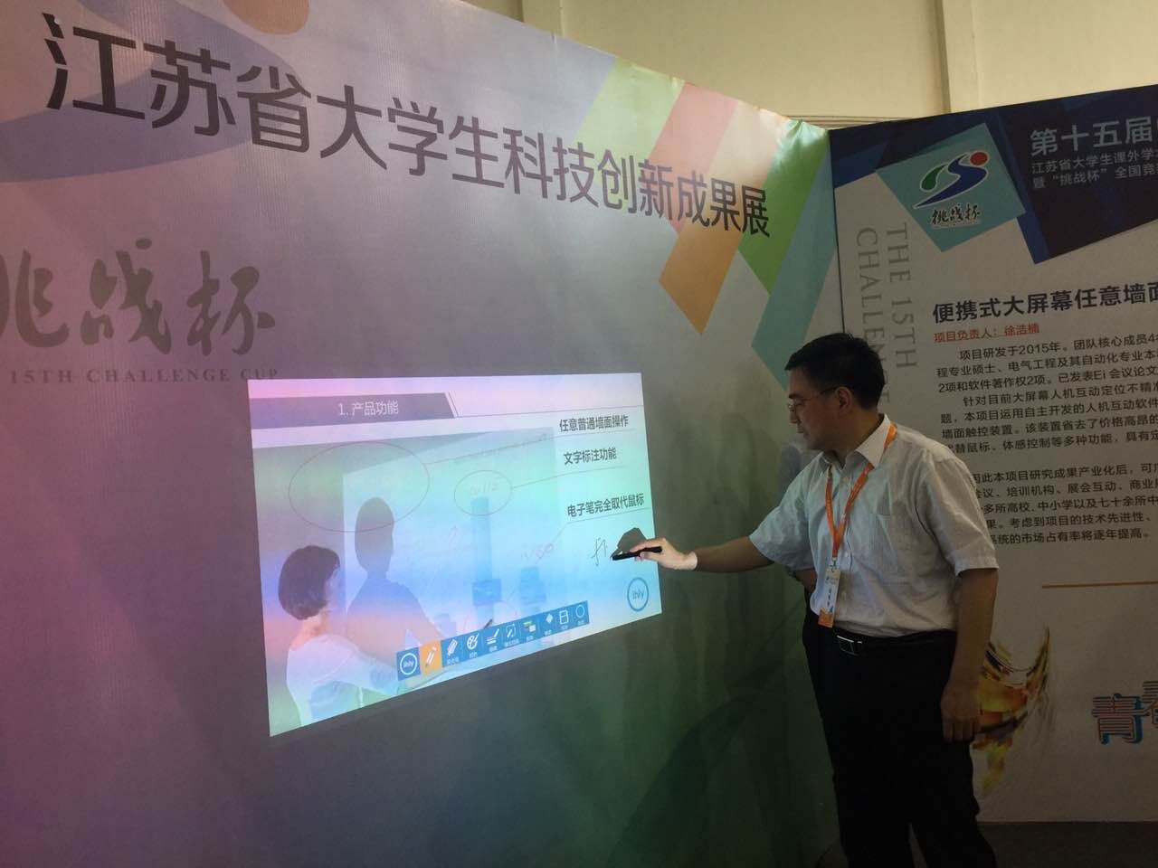 开幕式后,江苏省政府副秘书长陆留生,共青团江苏省委书记王伟等领导参观了大学生科技创新成果展。领导们听取我院学生的科技作品”便携式大屏幕任意墙面触控装置”的介绍,给予高度肯定,鼓励同学们将科技成果进行市场转化。参展作品以其精准的红外定位、良好的人机触控互动,引得其他高校参赛师生驻足观看。