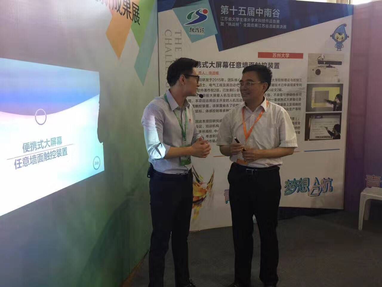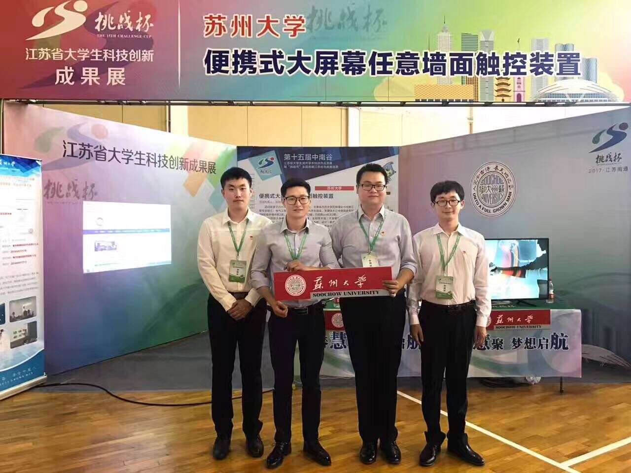 6月2日至4日,团省委、省科协、省教育厅、省学联、南通市政府共同主办,南通大学承办的第十五届江苏省大学生课外学术科技作品竞赛暨“挑战杯”全国竞赛江苏省选拔赛决赛在南通大学举行。我院由余雷老师指导,学生戴广军、王鹏和徐浩楠所参与的课题“便携式大屏幕任意墙面触控系统”在本次比赛中勇夺特等奖并入围国赛。
