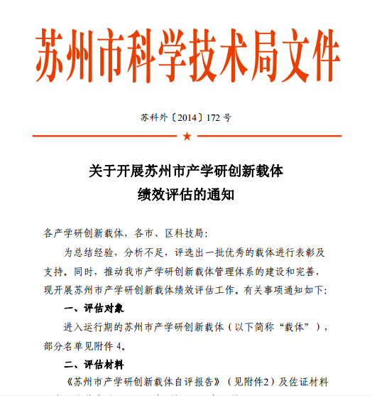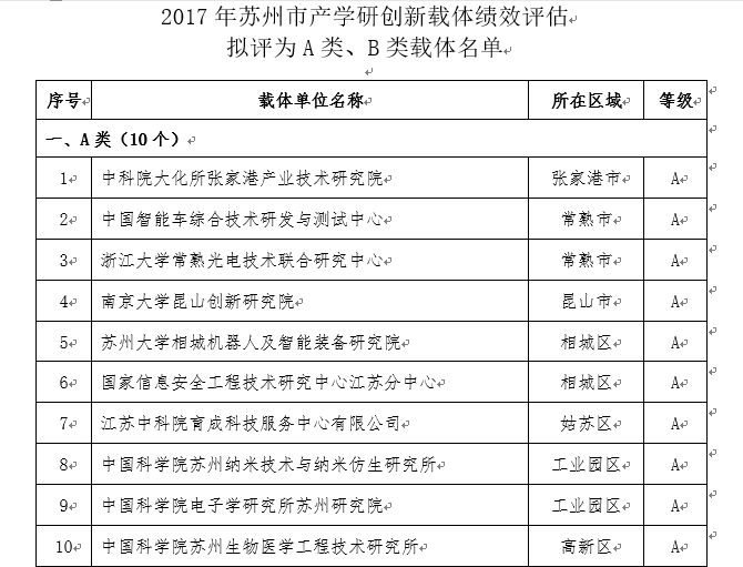 12月11日,苏州市科学技术局公示了2017年苏州市产学研创新载体绩效评估结果,我院顺利通过绩效评估并入围A类载体。全市共有94家产学研创新载体参与评选,其中获得A类的仅有10家。本次评估通过建设单位自评、主管单位评价、现场答辩、综合评估等环节,主要考评载体的服务能力与条件、业务建设与成效、社会影响、典型案例等,评选出一批建设优秀单位进行表彰及支持。