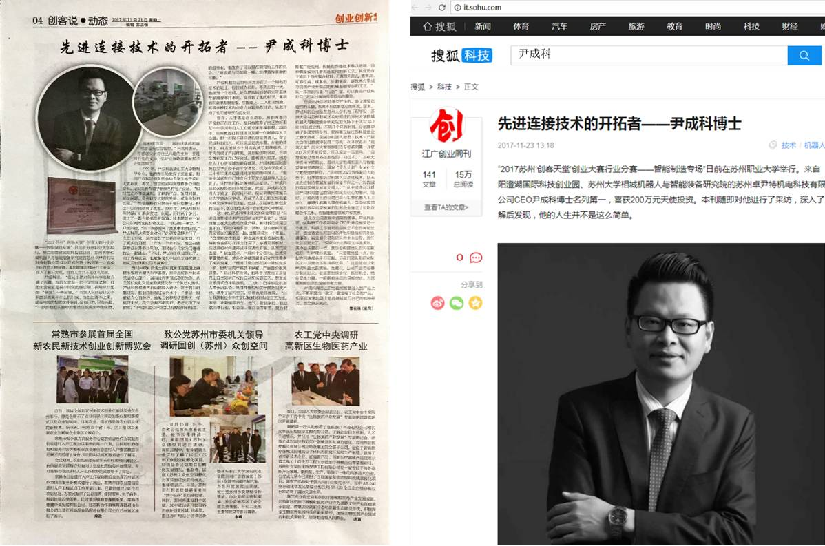 尹成科博士在机电一体化、高端装备制造领域获得了多项国际前沿研究成果,拥有多项发明专利。曾研制成功国内首套磁悬浮人工心脏核心组件,获国际旋转血泵学会(ISRBP)颁发的青年学者奖,是该学会成立20多年来首位获得此项奖励的中国人。数次赴美、欧、日开展调查研究,与学术、产业相关领域内国际前沿技术专家建立了密切合作。今年年初,在苏州大学机电工程学院、苏州大学相城机器人与智能装备研究院的支持下,尹成科博士成立苏州卓尹特机电科技有限公司,开展科技成果转化和产业化推广。得益于多年的技术和行业积累,公司成立不久,就在多层复合材料连接工艺、磁悬浮特种电机与控制技术等创新领域取得突破,拥有了核心自主知识产权,申请了多项发明专利,客户已涵盖国内高端医疗器械、新能源汽车、军工航天、电气自动化等众多高精尖行业,并开始走向海外。同时,公司获得了第五届江苏科技创业大赛优秀奖、国际机器人标准?技术?产品大会项目路演二等奖、苏州“创客天堂”创业大赛智能制造专场第一名,在本次全国智能制造(中国制造2025)创新创业大赛全国总决赛中进入创业组全国十强,被江苏广电创业周刊、搜狐科技等媒体专题报道。