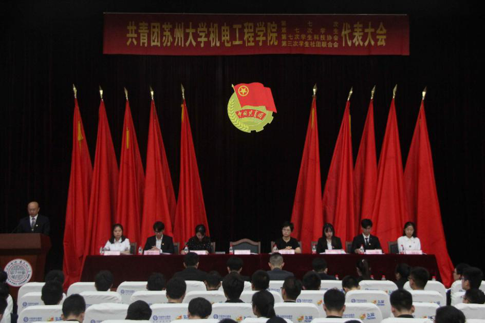 9月26日下午15:30,共青团苏州大学机电工程学院第七次代表大会暨第七次学生代表大会、第七次学生科技协会代表大会和第三次学生社团联合会代表大会在阳澄湖校区图书馆大报告厅召开。院党委书记刘鲁庆,校团委副书记于潜驰、校学生会副主席姚姚、校学生科技协会理事会委员蒙绘一、校社团联合会副主席房宸,院党委副书记、副院长袁红,院团委书记李丽红,辅导员陈恺、吕畅达出席了本次大会,108名正式代表参加了大会。