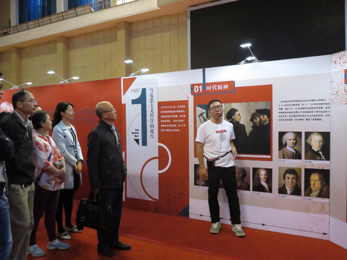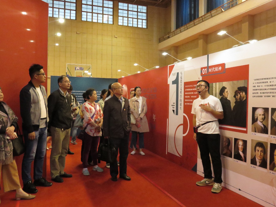 在解说员的带领下,现场师生认真聆听和参观,一张张照片、一篇篇文献、一段段文字无不展现了马克思为追求真理和实现人类解放不懈奋斗的一生。特别是《共产党宣言》——马克思和恩格斯为共产主义者同盟起草的理论和实践纲领,永远闪耀着真理光辉的巨著《资本论》——马克思毕生从事科学研究和革命斗争所取得的伟大成果,以及马克思主义基本原理在中国革命和建设中的应用等,给观展师生留下了深刻的印象。