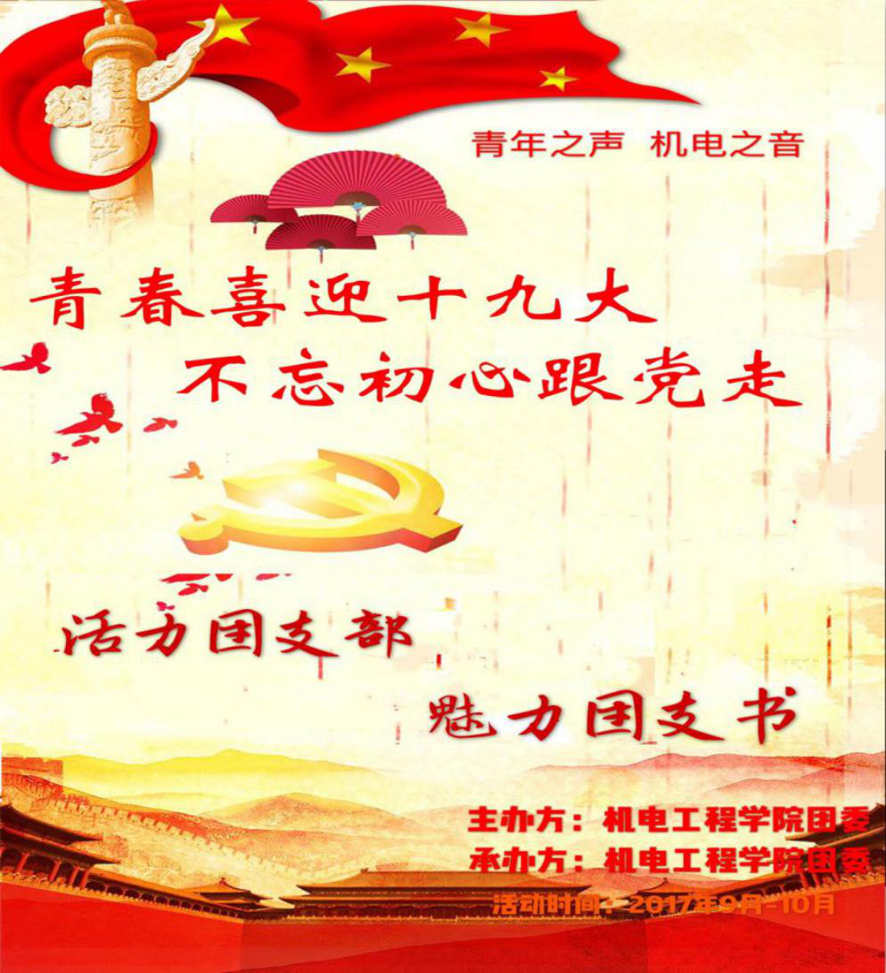 2017年9月—10月,为认真贯彻习近平总书记系列重要讲话精神和治国理政新理念新思想新战略特别是视察江苏重要讲话精神,以优异成绩迎接党的十九大胜利召开,机电工程学院团委在校团委的领导下、在院党委的指导下,结合当前共青团改革的新要求,在全院各团支部中开展了青年之声 • 机电之音 ‖ “青春喜迎十九大,不忘初心跟党走”系列活动之“活力团支部,魅力团支书”风采展示活动,并评选出了六位魅力团支书、六个活力团支部在学院微信平台上进行了风采展示系列推送。并且,该活动成功在校团委官微进行了推送。