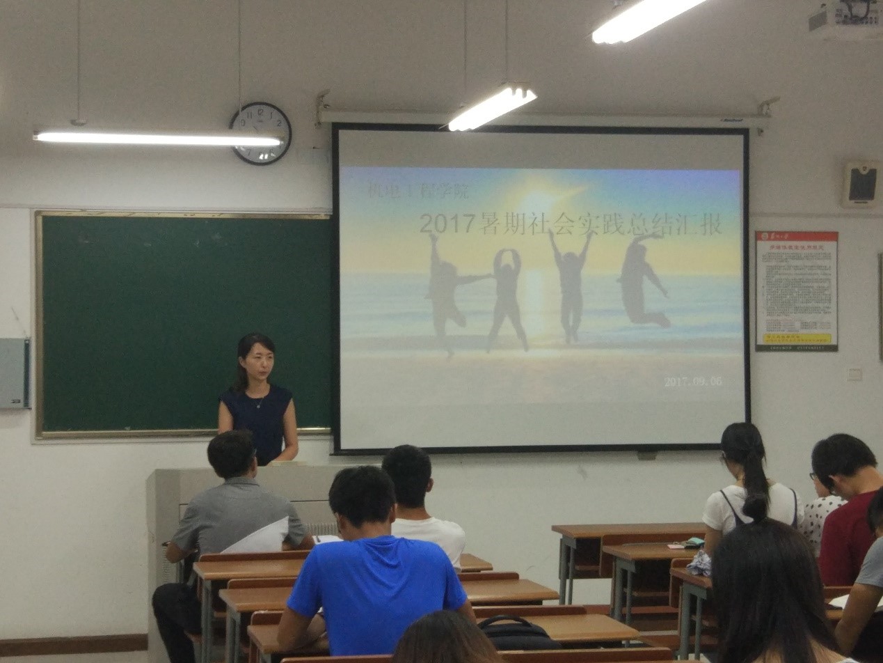 2017年9月6日下午6点,由苏州大学机电工程学院科技协会举办的机电工程学院2017年暑期社会实践总结汇报在阳澄湖1B204教室举行。参加此次仪式的有机电工程学院党委副书记、副院长袁红,团委老师陈恺,以及各个暑期社会实践重点团队负责人和成员。